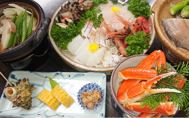 ぷりぷりの歯ごたえのタグ付地蟹をカニ刺し・焼きガニ・カニ雑炊など贅沢にお召し上がりください。夕食だけでなく朝食でもカニご飯・カニのお味噌汁と、カニをしっかりお楽しみいただける大変お得なプランです。さらに、お米・野菜・雑炊の海苔などは自家製のものを使用し、安心・安全な食材でおもてなし致します。